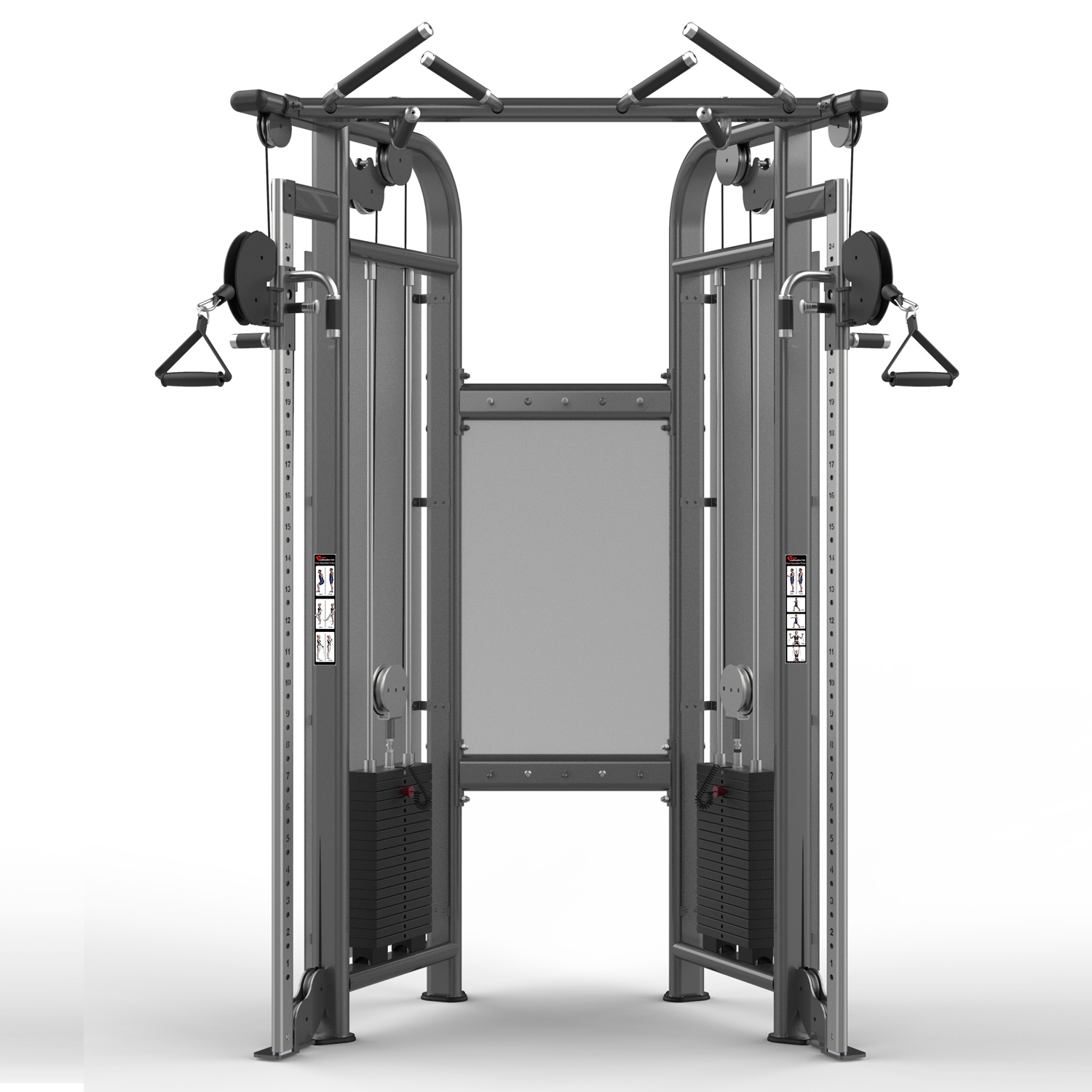 Model FM-1002 to rozbudowana wersja flagowej bramy Dual Adjustable Pulley, stworzona z myślą o użytkownikach potrzebujących większego oporu. Wyposażona w potężne stosy o łącznej wadze ponad 238 kg (526 lbs), pozwala na progresję siłową w ćwiczeniach takich jak wyciskania, przyciągania czy martwe ciągi na wyciągu. Płynna, wielostopniowa regulacja wysokości oraz zintegrowany drążek do podciągania czynią z niej najbardziej kompletną stację treningową w Twoim klubie.