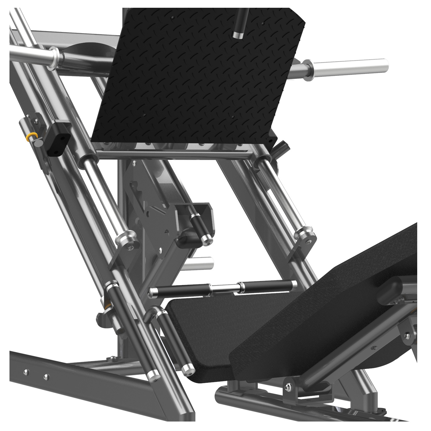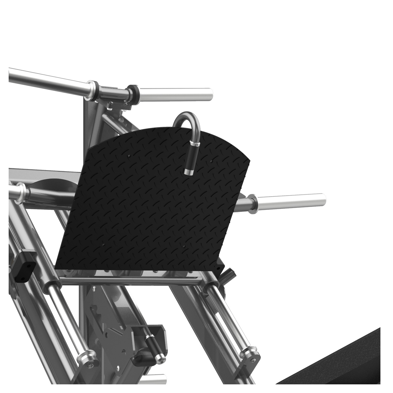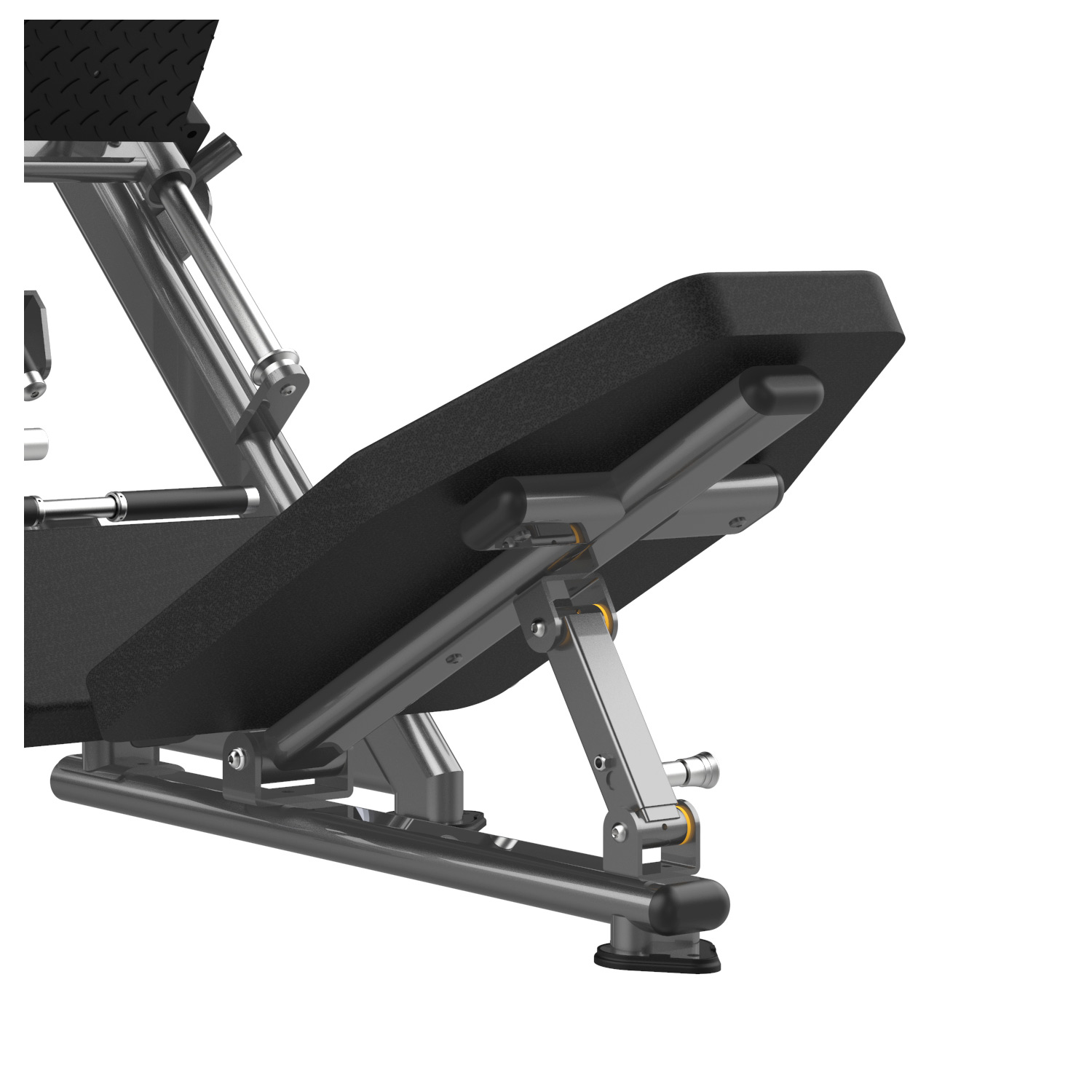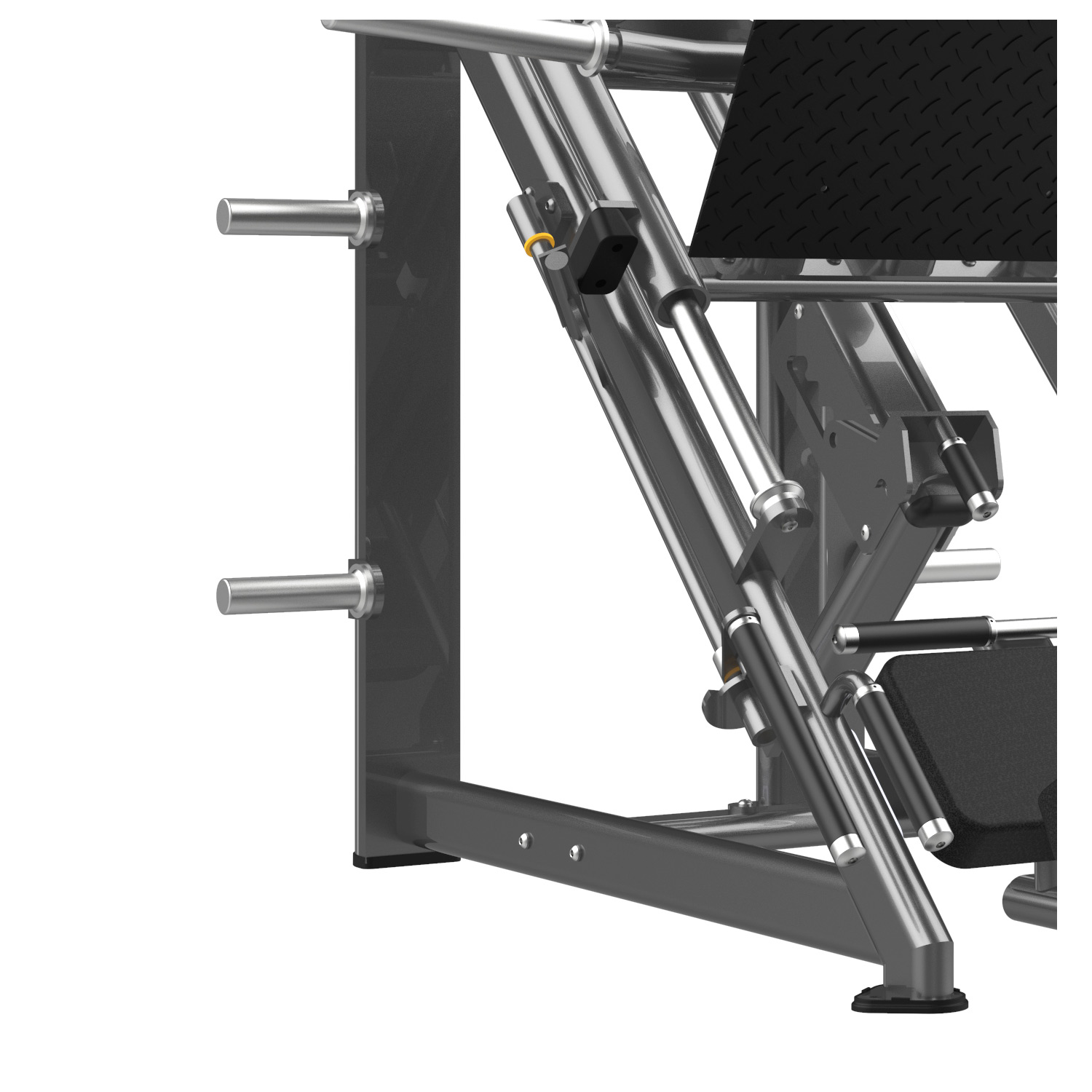 Maszyna posiada łatwo dostępne dźwignie blokady wózka (po obu stronach siedziska), które można obsłużyć jednym ruchem ręki. Dodatkowo, pośrodku prowadnic znajduje się regulowany ogranicznik bezpieczeństwa, który zatrzyma wózek, jeśli nie uda Ci się wypchnąć ciężaru – dzięki temu możesz trenować sam, bez asekuranta. Regulowany kąt oparcia pozwala dopasować maszynę do mobilności bioder użytkownika.
