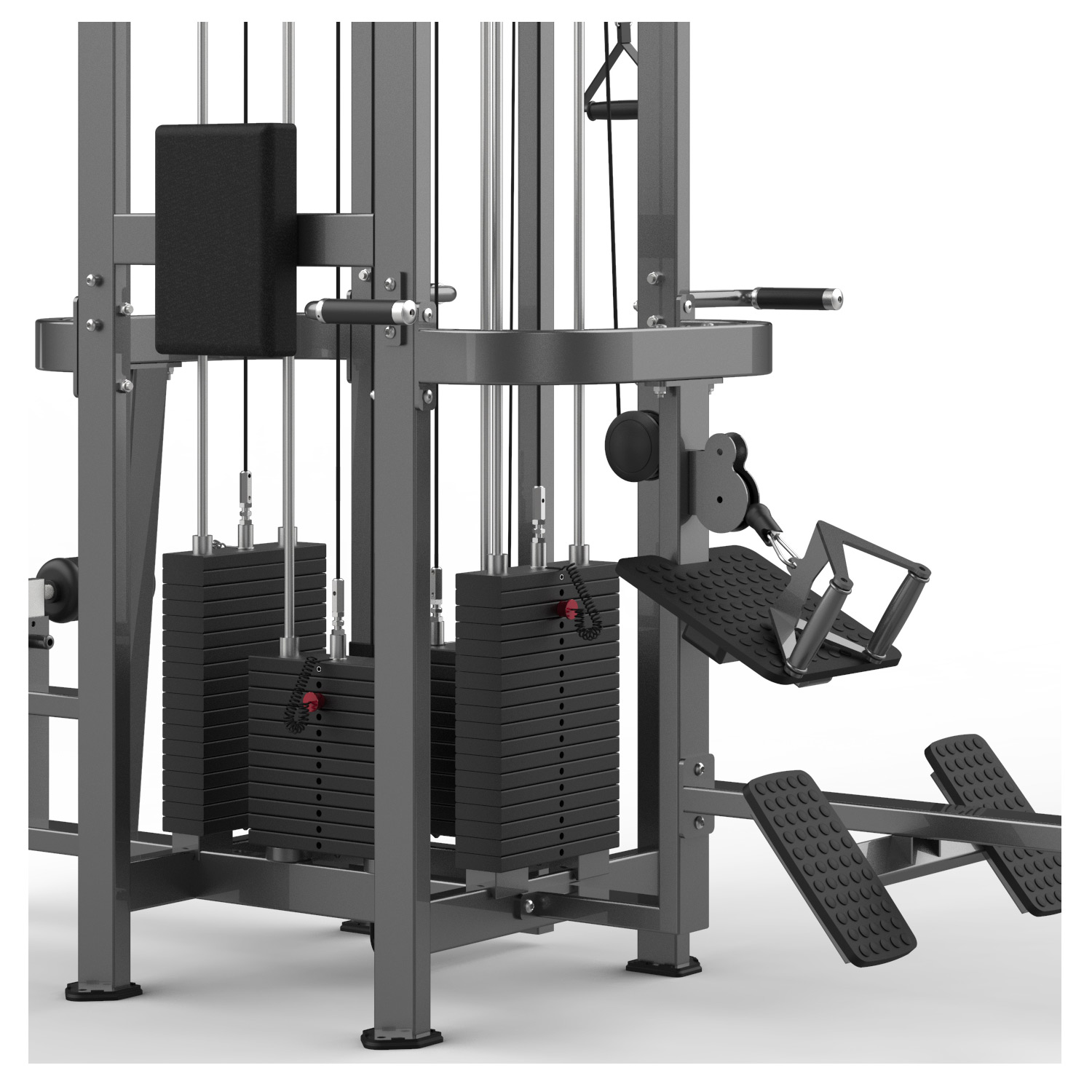 Model FM-2004 (4-Stack Multi Station) to centrum treningowe typu „Jungle Gym”, które łączy funkcjonalność czterech niezależnych maszyn. Użytkownicy mają do dyspozycji: ściąganie drążka (plecy), wiosłowanie (plecy), prostowanie na triceps oraz w pełni regulowany wyciąg (biceps/barki). Idealne rozwiązanie optymalizujące przestrzeń w klubie fitness.