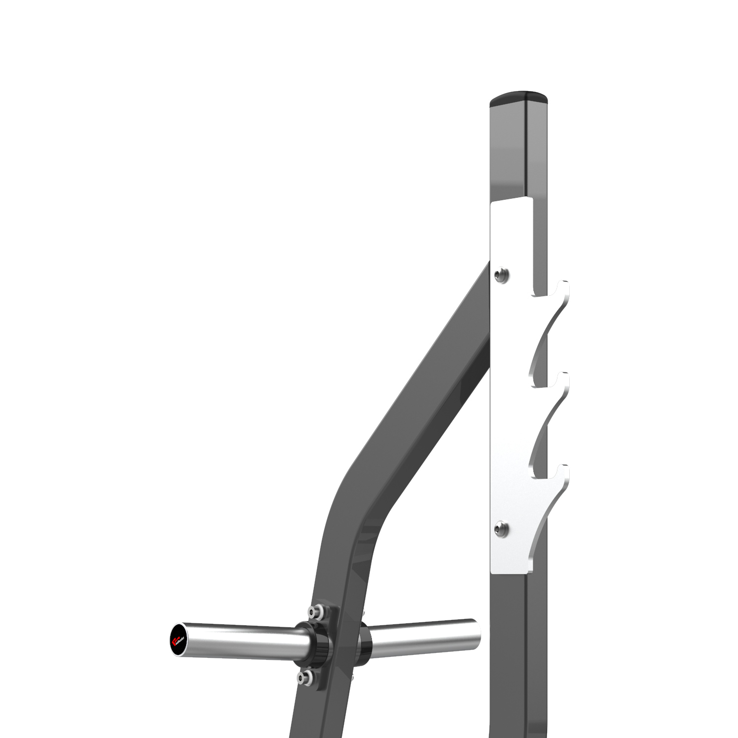 Zintegrowane po bokach trzpienie na obciążenia (Weight Horns) sprawiają, że talerze są zawsze pod ręką. Eliminuje to potrzebę dostawiania osobnych stojaków i pozwala utrzymać porządek w strefie siłowej.