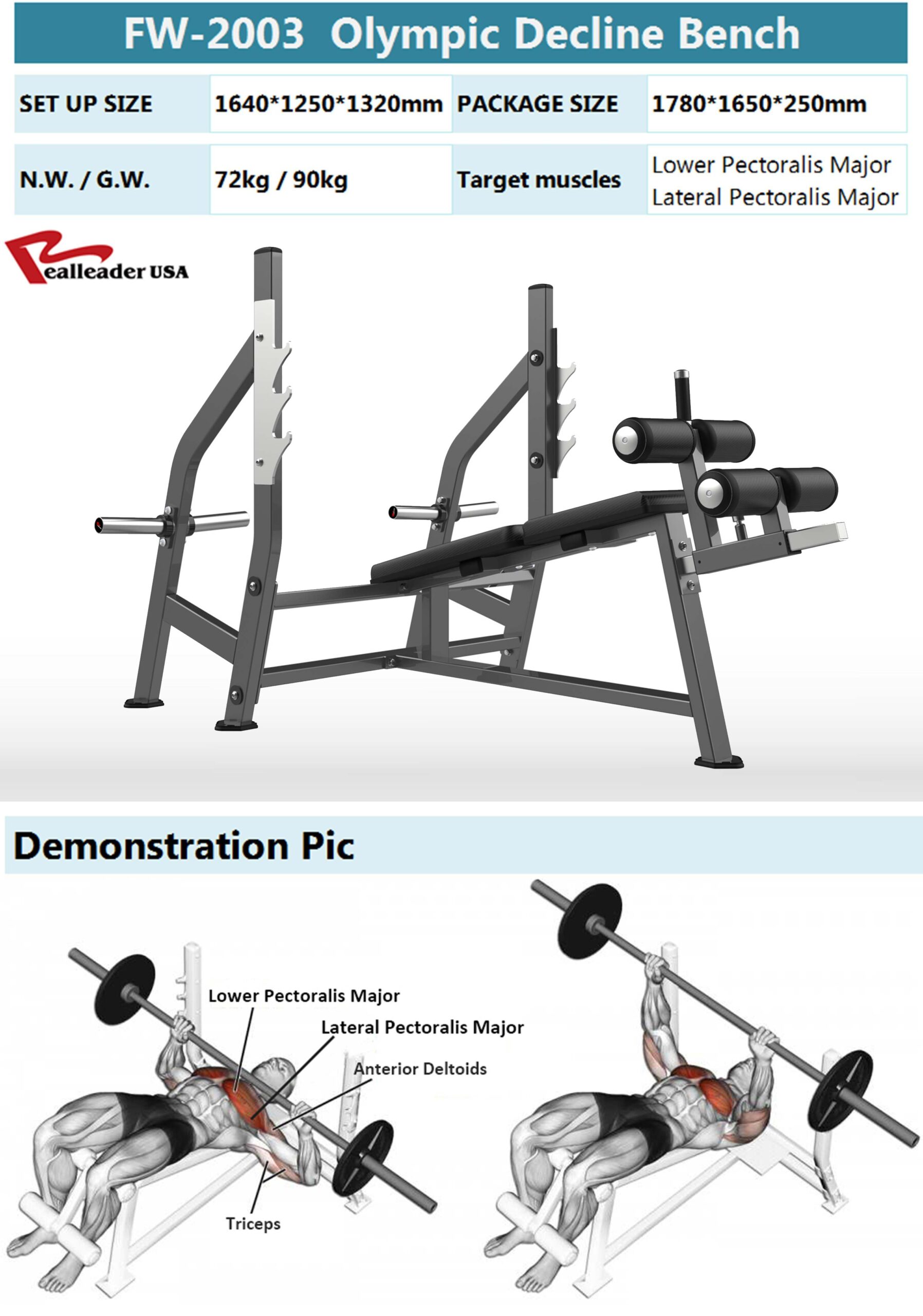 Model FW-2003 (Olympic Decline Bench) to ławka olimpijska o stałym kącie ujemnym, stworzona do atakowania dolnych aktonów mięśni piersiowych. To właśnie to ćwiczenie odpowiada za wyraźne „odcięcie” klatki od mięśni brzucha. Wyposażona w wygodne i solidne wałki blokujące nogi, zapewnia pełną stabilność, zapobiegając zsuwaniu się użytkownika, co pozwala bezpiecznie skupić się na wyciskaniu potężnych ciężarów.