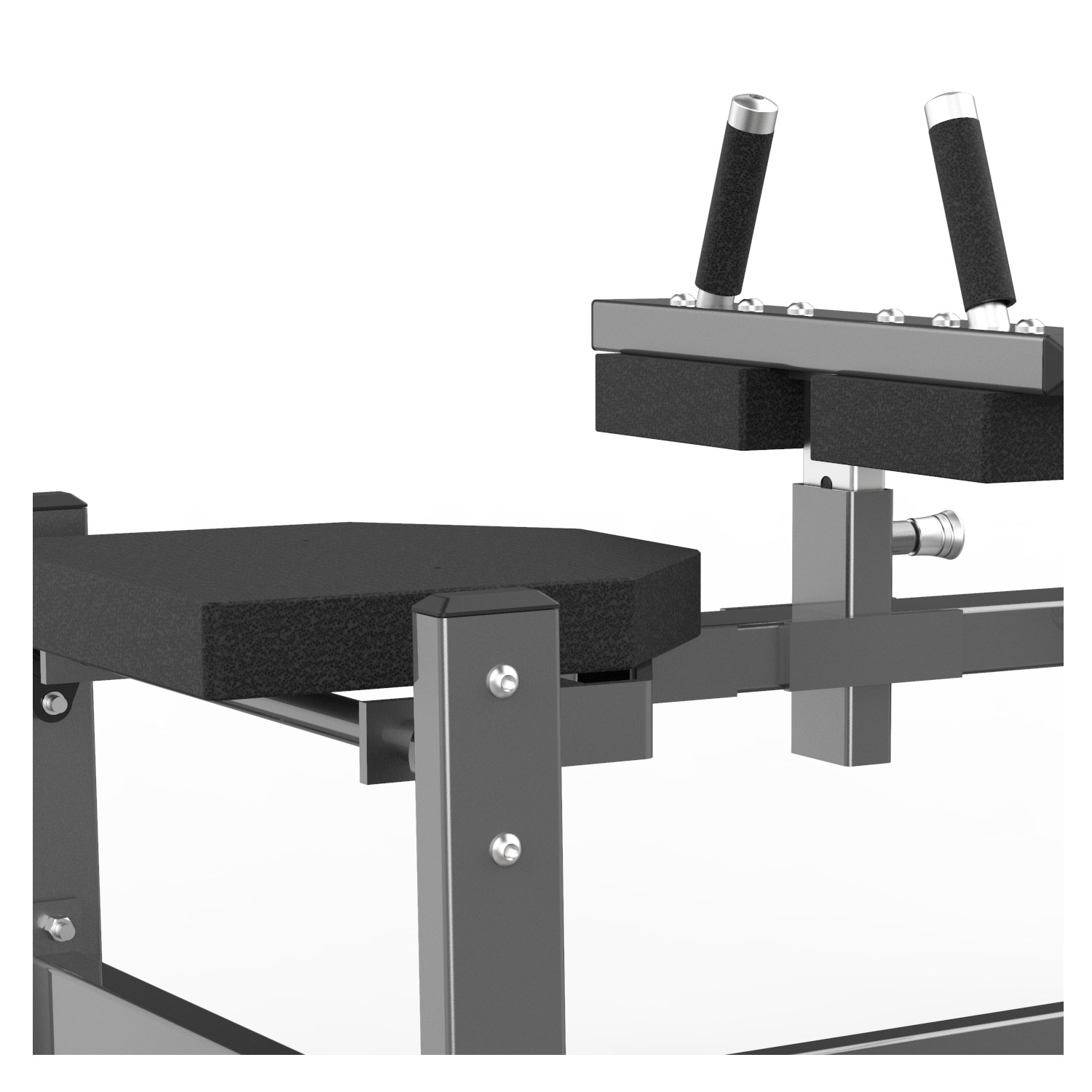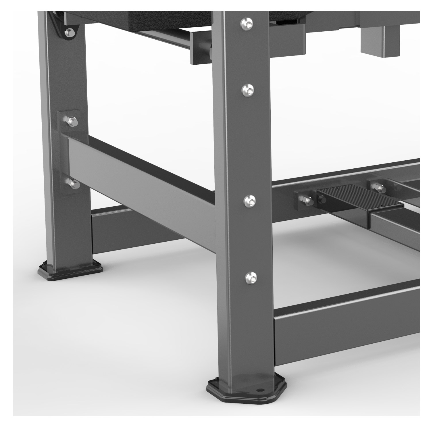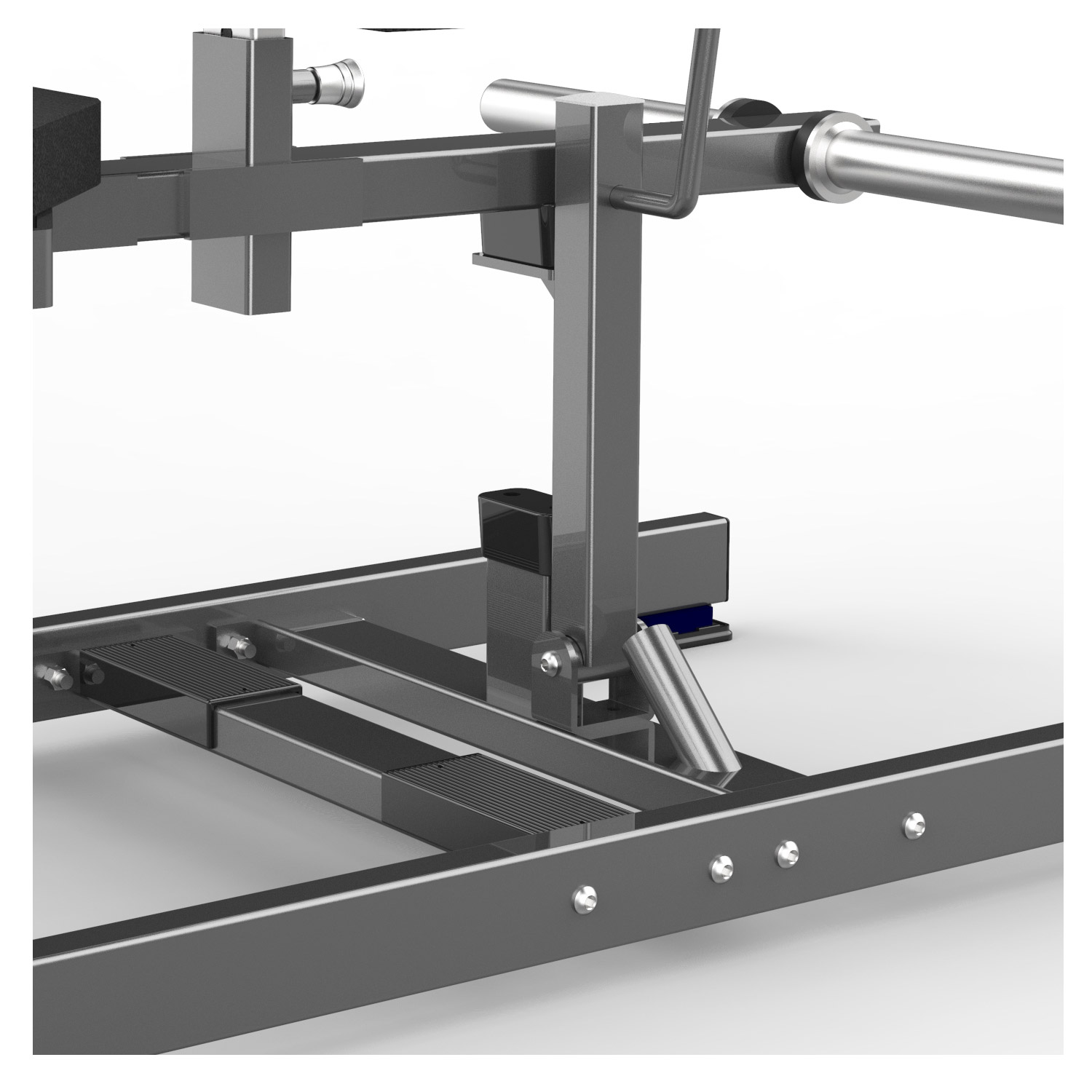 Regulowana Blokada: Poduszki blokujące uda posiadają regulację wysokości/głębokości, dzięki czemu każdy użytkownik – niezależnie od długości nóg – może stabilnie zablokować kolana pod ciężarem.