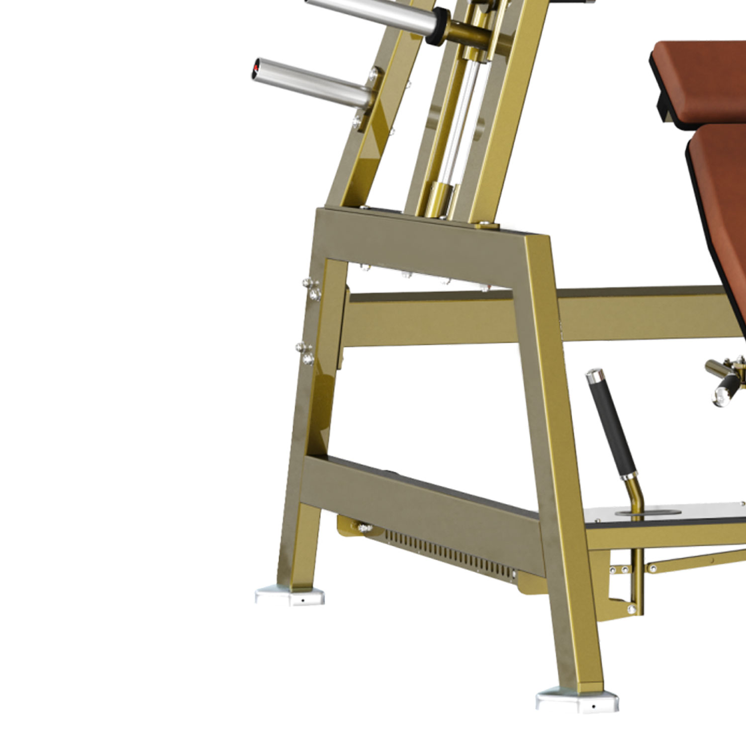 Otwarta budowa ramy pozwala na łatwe wstawienie dowolnej ławki regulowanej. Zintegrowane po bokach trzpienie na obciążenia (Weight Horns) sprawiają, że talerze są zawsze pod ręką, co przyspiesza zmianę obciążenia.