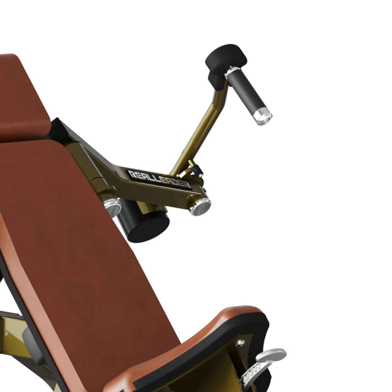 Maszyna wyposażona jest w wygodne oparcie i regulowane siedzisko, co pozwala dopasować pozycję do wzrostu użytkownika. Ergonomiczne uchwyty ustawione są w pozycji pionowej (chwyt neutralny), co jest najbardziej naturalnym ułożeniem dłoni przy ruchach rozpiętek, minimalizującym stres na nadgarstki.