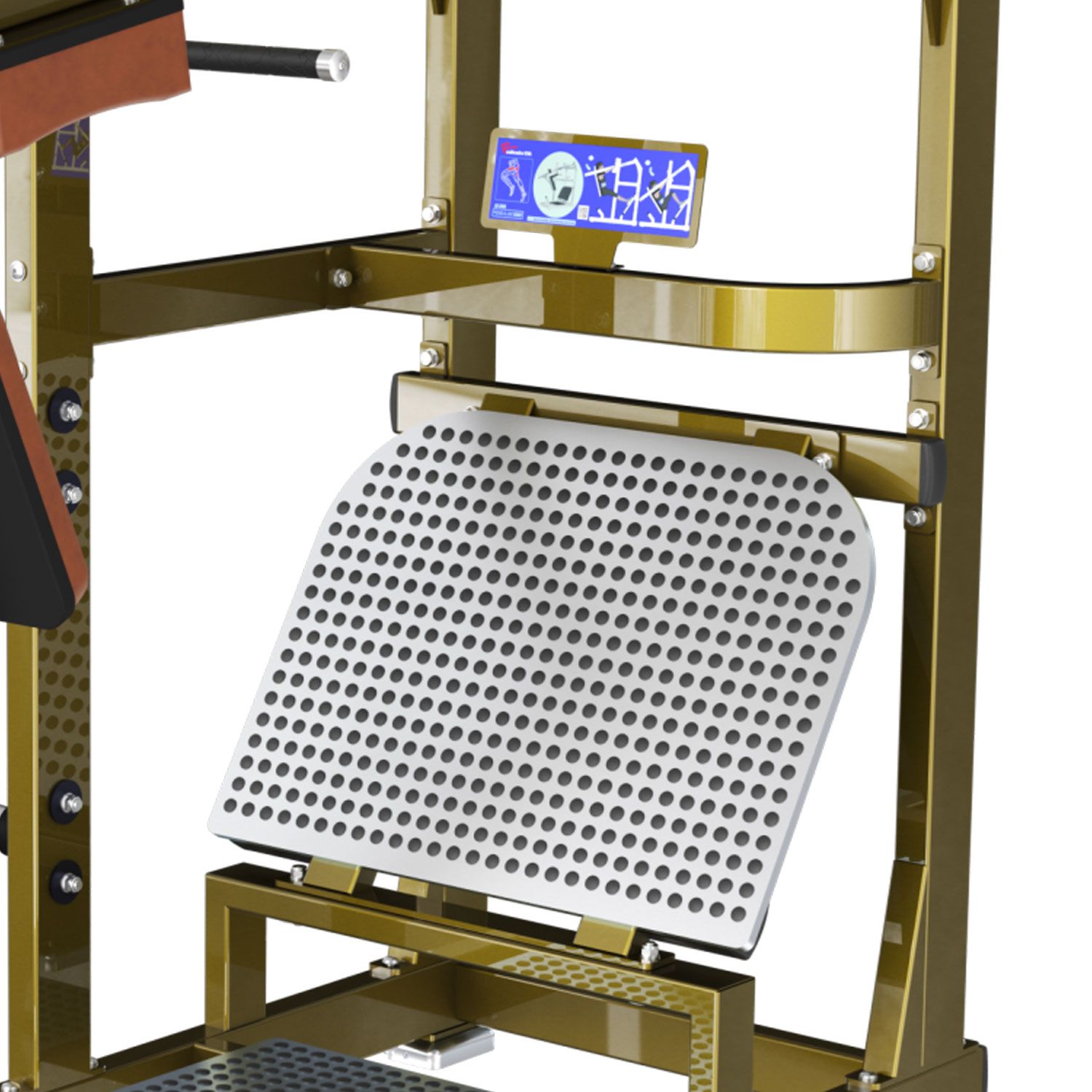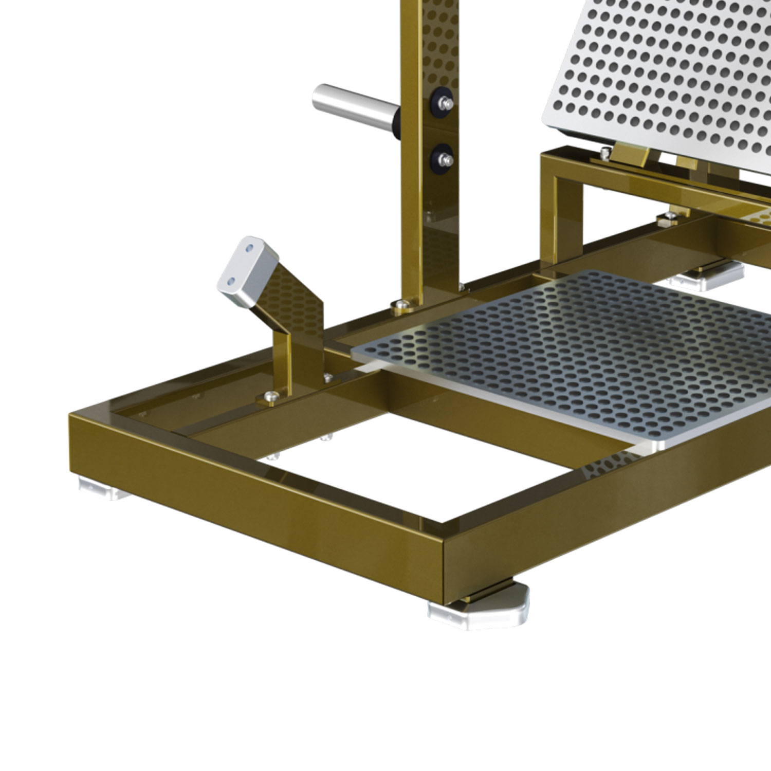Szeroka, antypoślizgowa platforma posiada regulację kąta nachylenia. Pozwala to każdemu użytkownikowi – niezależnie od mobilności stawu skokowego – znaleźć idealną, bezpieczną pozycję stóp do wykonania pełnego przysiadu.