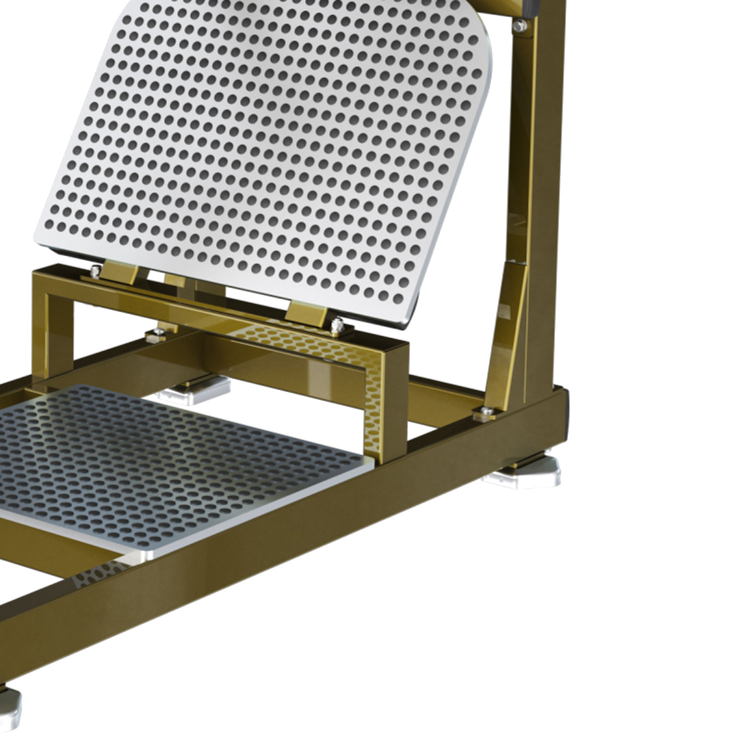Szeroka, ryflowana platforma pod stopy posiada regulację kąta nachylenia. Możesz ustawić ją bardziej płasko (większy nacisk na całe uda) lub pod kątem (imitacja przysiadu w butach ciężarowych), co pozwala precyzyjnie celować w głowy mięśnia czworogłowego („łezkę”).