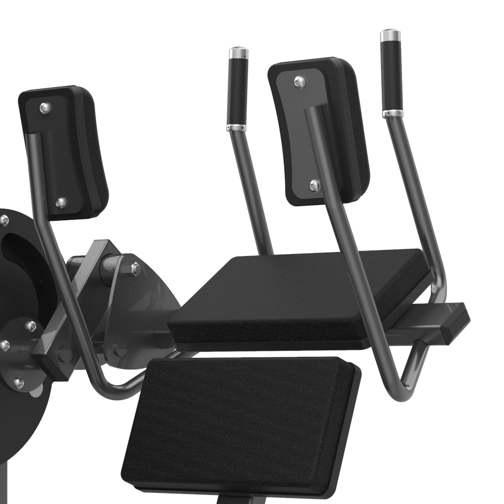 Maszyna posiada wygodne, profilowane poduszki na plecy oraz specjalne uchwyty (uprząż) nad głową lub przy klatce piersiowej (zależnie od wariantu), które pozwalają na komfortowe wykonanie skłonu bez ciągnięcia głowy rękami. Regulowane siedzisko umożliwia dopasowanie osi obrotu maszyny do talii użytkownika, co jest kluczowe dla bezpieczeństwa kręgosłupa.
