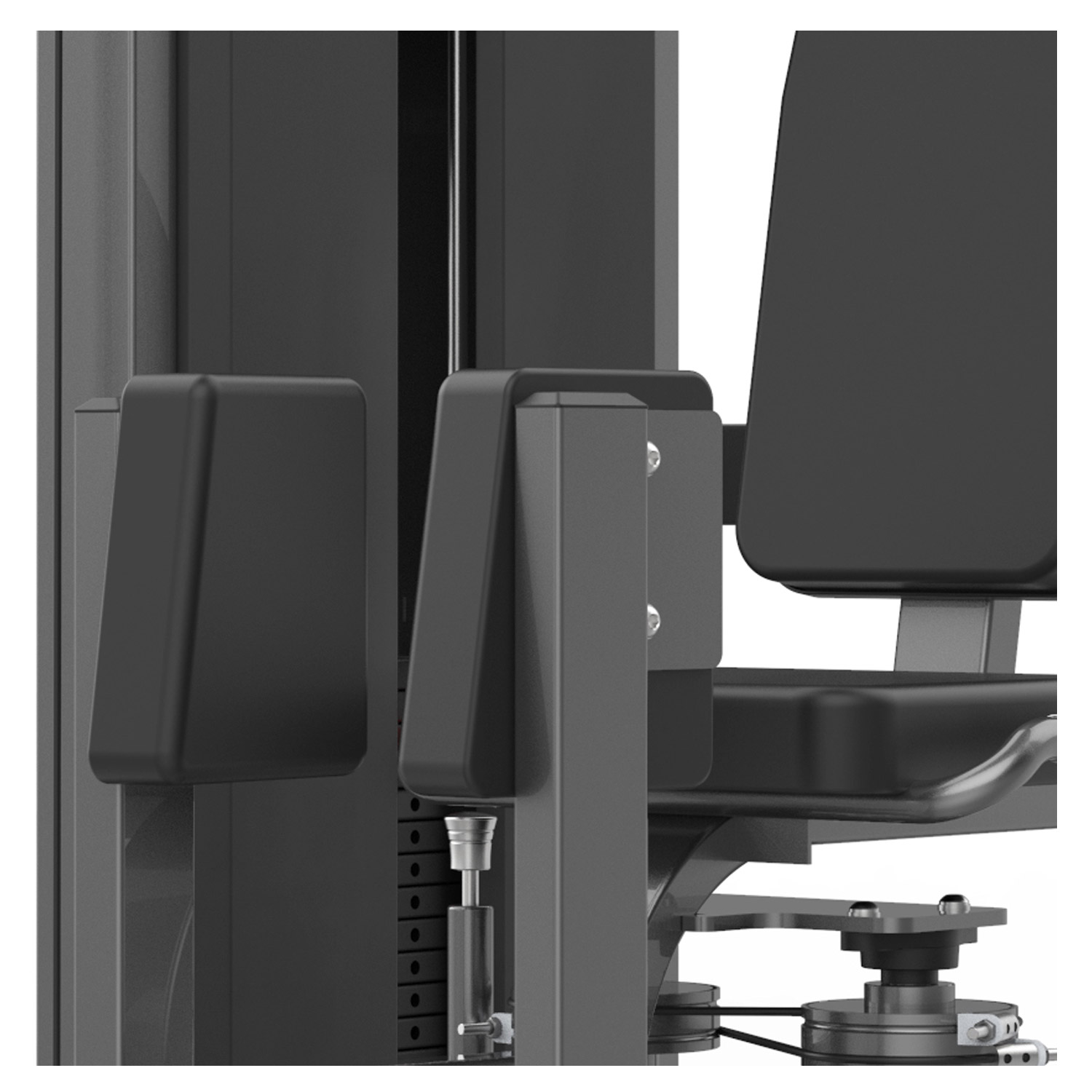 Jako przedstawiciel serii Premium, model M3-1003 wyróżnia się pełną, estetyczną obudową stosu. Chroni ona mechanizm przed kurzem i zapewnia bezpieczeństwo użytkowania. Na szczycie obudowy znajduje się praktyczna półka na telefon i wodę, co zwiększa komfort treningu. Nowoczesna linia ramy idealnie wpisuje się w wystrój ekskluzywnych klubów fitness.