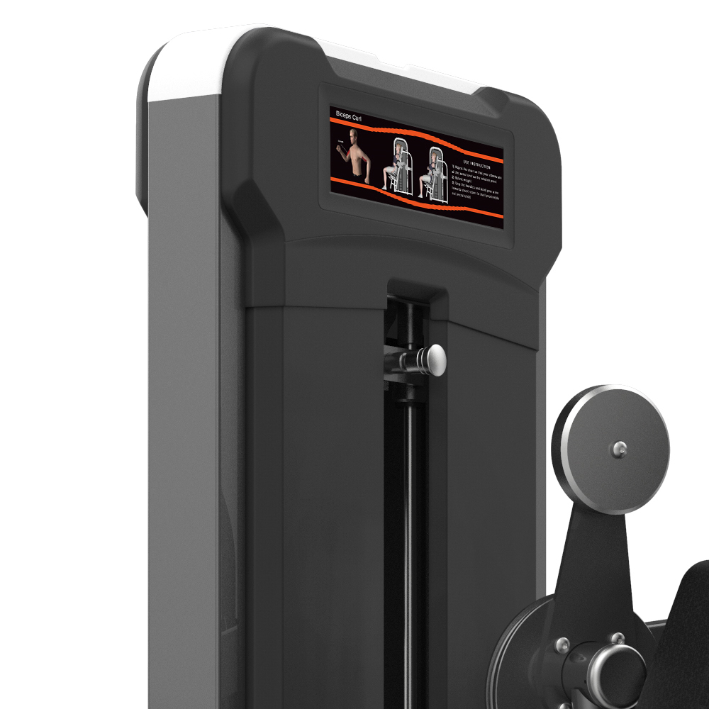 Model M3-1010 prezentuje się niezwykle nowocześnie. Stos obciążeń jest całkowicie zabudowany estetyczną osłoną, co wycisza pracę sztabek i zwiększa bezpieczeństwo w klubie. Praktyczna półka na górze obudowy (na telefon/wodę) to standard w serii Premium, który doceniają klienci komercyjni.