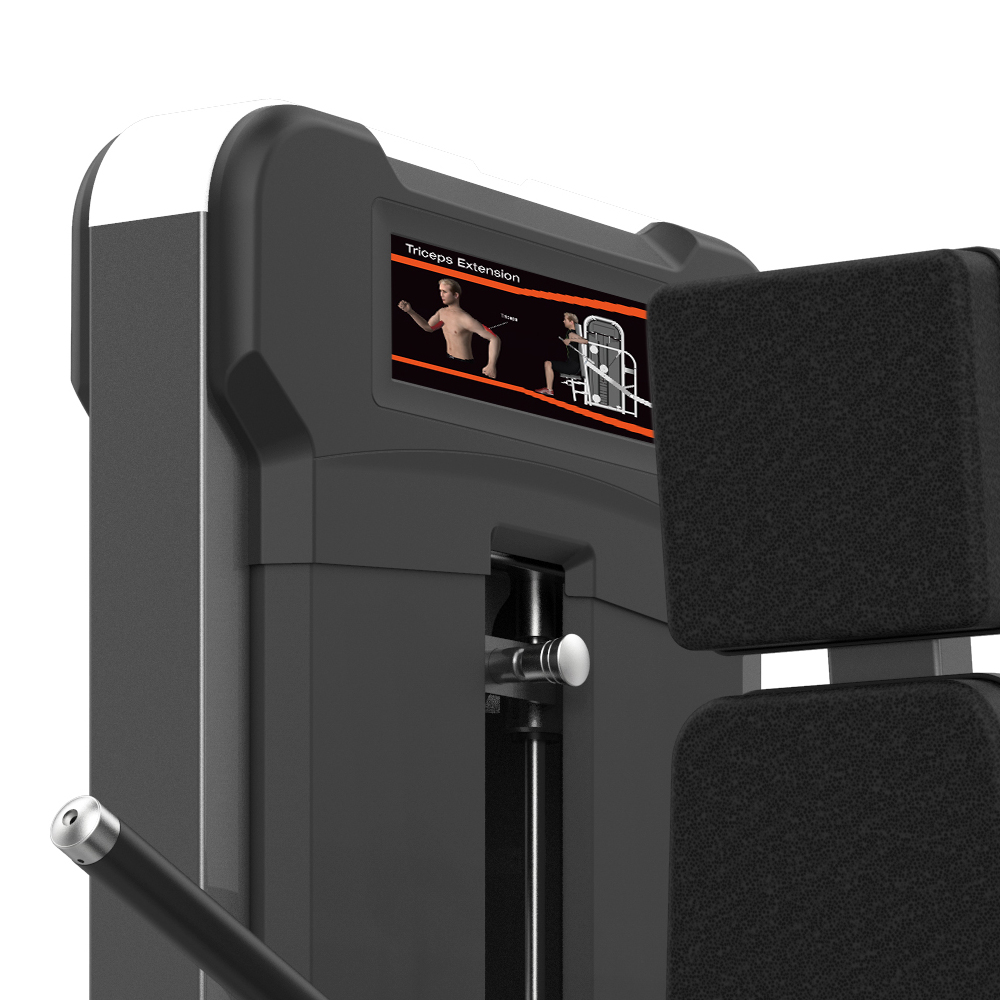 Maszyna wyposażona jest w samopoziomujące, obrotowe uchwyty, które podążają za ruchem nadgarstka, chroniąc go przed przeciążeniem. Regulowane siedzisko (siłownik gazowy) pozwala idealnie dopasować wysokość użytkownika do osi maszyny. Całość zamknięta jest w estetycznej, nowoczesnej ramie serii M3 z pełną osłoną stosu, co podnosi standard wizualny siłowni.