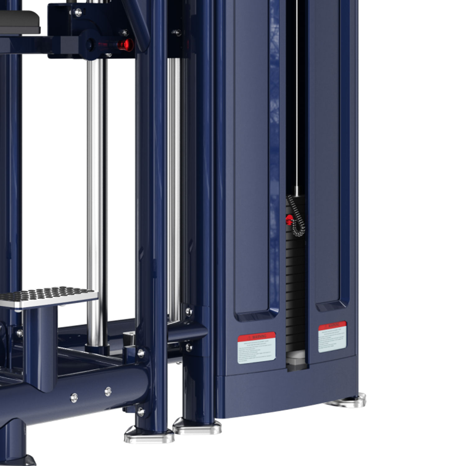 Maszyna posiada wygodne stopnie ułatwiające wejście na podest. Pełna osłona stosu chroni użytkownika, a solidna konstrukcja ramy gwarantuje stabilność – urządzenie nie chwieje się nawet przy dynamicznych ruchach.