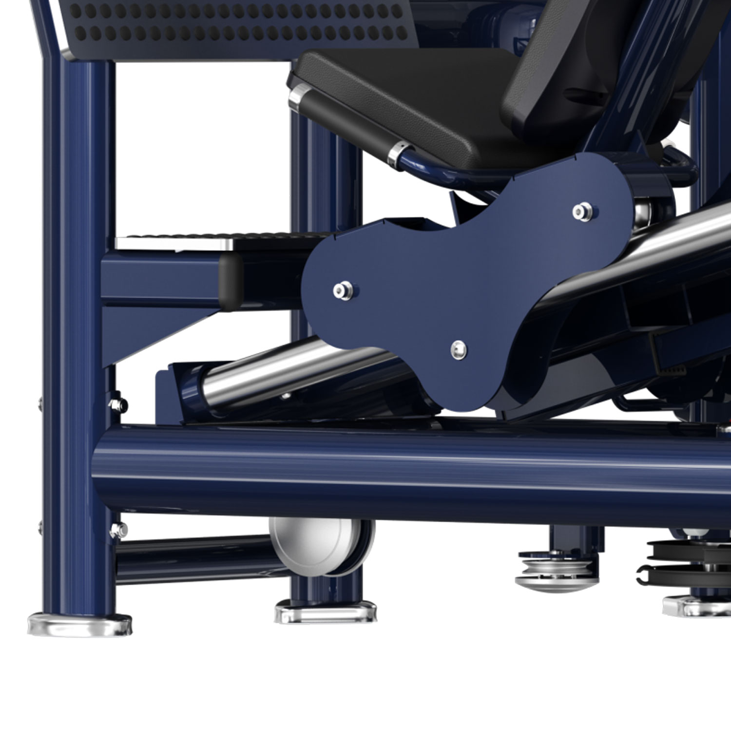 Regulowane sanie: Siedzisko przesuwa się na precyzyjnych prowadnicach, co pozwala dostosować odległość od platformy do wzrostu użytkownika. Możesz ustawić maszynę tak, aby zaczynać ruch z kolanami blisko klatki piersiowej (maksymalne rozciągnięcie).